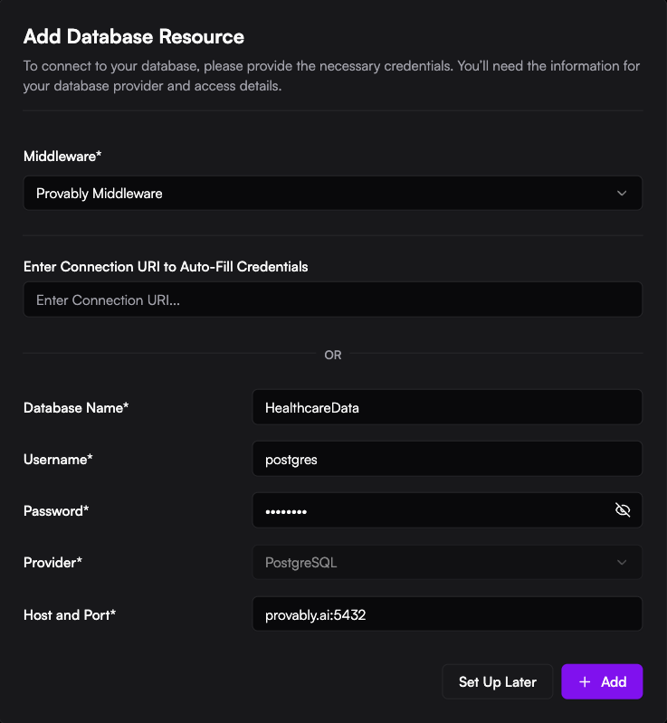 Next, you can link your data source to Provably. You’ll need your database provider details and access credentials ready.