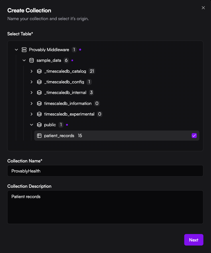 A collection is essentially a bridge between a specific table in your database and the Provably platform. This is how you define exactly what data is available for proof generation.