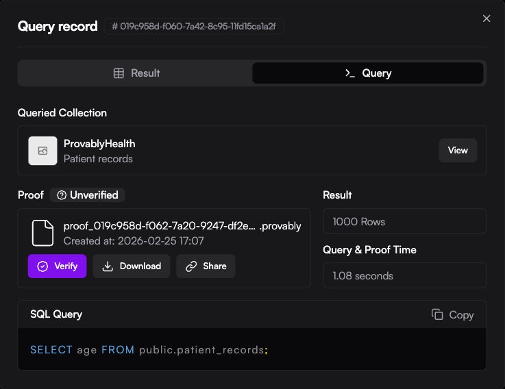 - Verify and Share: From this screen, you can Verify the proof immediately, Download it for your records, or Share a link to the result with others. You can also see the exact Query & Proof Time to track performance.