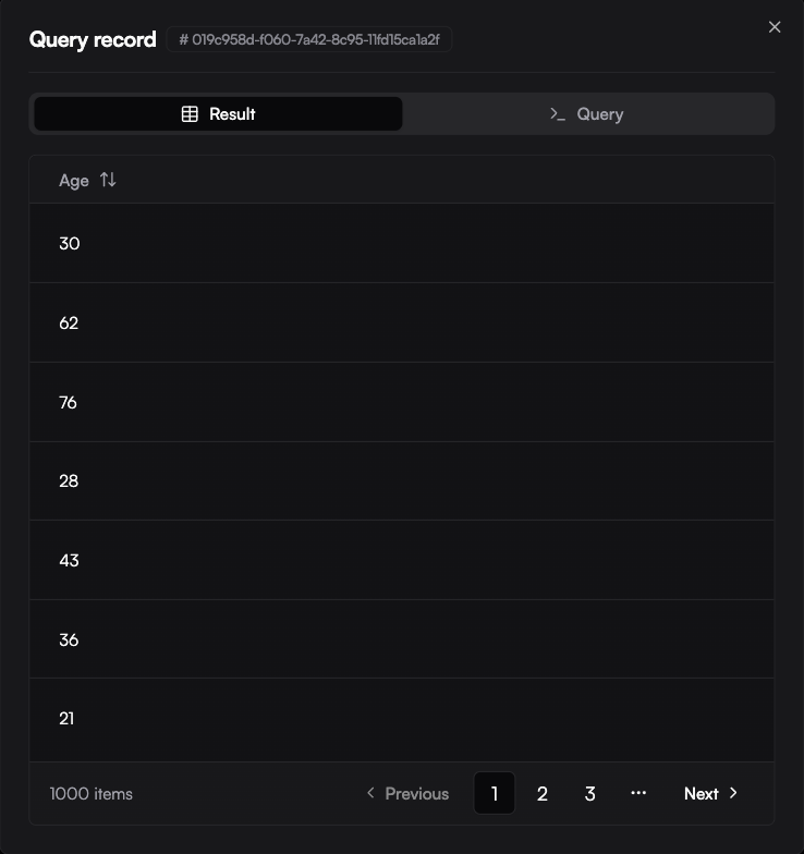- View Results: Click on the result notification to open the Query Record window. In the Result tab, you can browse through the specific data rows returned by your query.